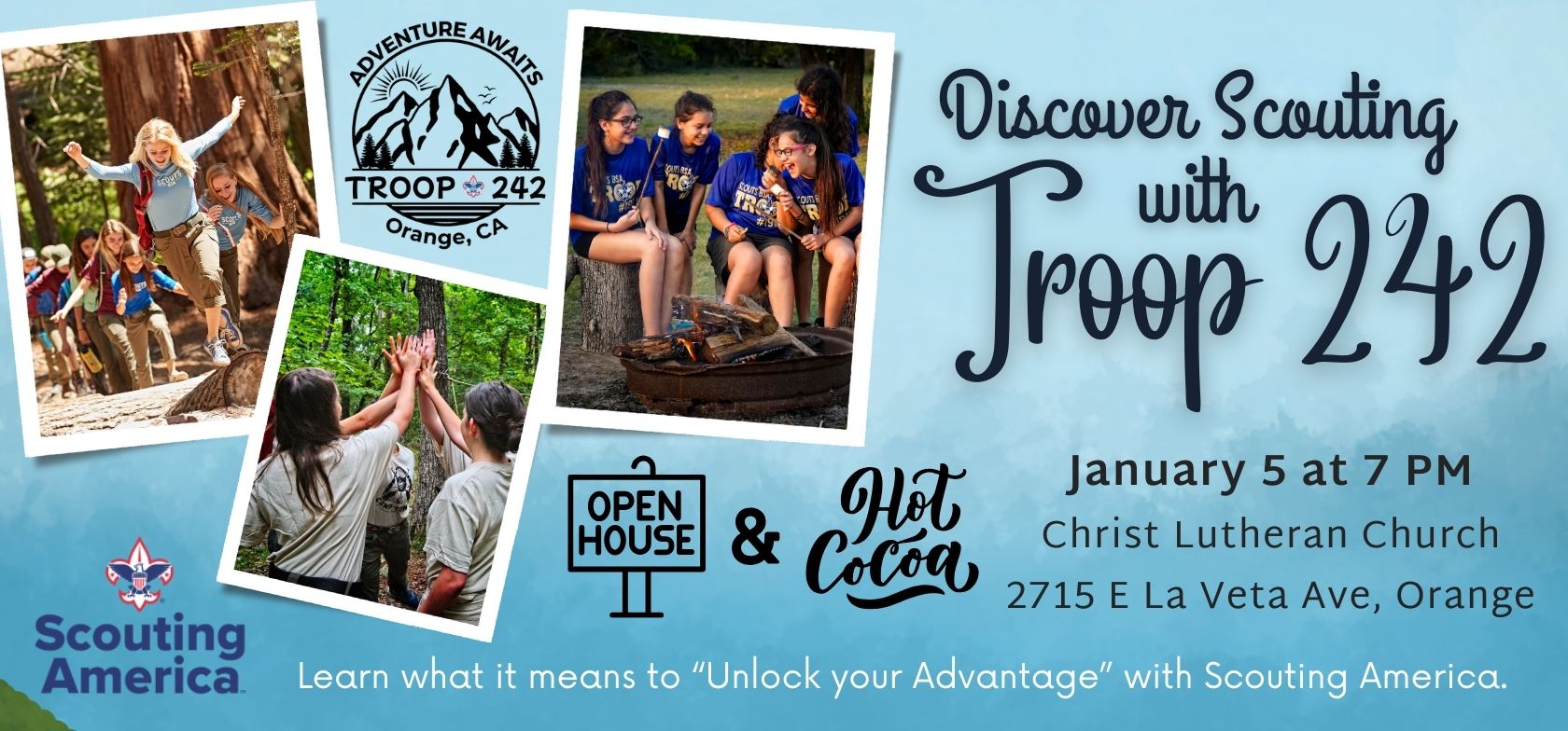 Christ Lutheran Church 2715 E La Veta, Orange, CA, United StatesLearn what it means to “Unlock your Advantage” with Scouting America and Troop 242. We will have a hot cocoa bar and fun activities to learn about our Troop! Monday, January 5 at 7PM Christ Lutheran Church 2715 E La Veta Ave, Orange