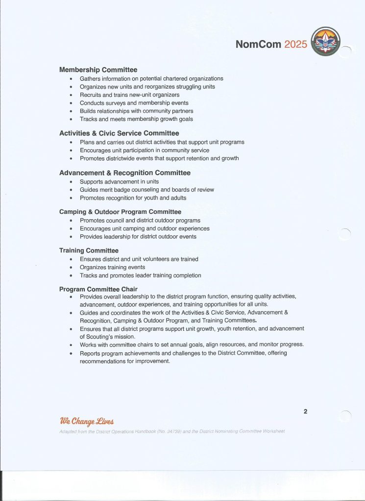 The Nominating Committee will be meeting over the next three months. We want all nominations submitted by Monday, January 5th. That week we will be putting together our slate which will be approved by the 2025 Charter Organization Representatives and Members-At-Large. This approval and election will take place at the District Annual Meeting held on Thursday, January 29 at 6 p.m. before the District Dinner. You do not have to attend the dinner unless you would like to celebrate those receiving awards at the dinner. The slate being approved at that meeting will be for the Canyons District Chair, Vice Chairs and Members-At-Large. All district approvals then will have their names submitted for Council approval at the Council Annual Meeting on Thursday, February 12 at 7 p.m.