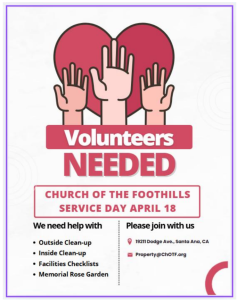 Church of the Foothills is inviting us to join them in a day of service by helping them complete tasks that need our assistance. More details coming soon.